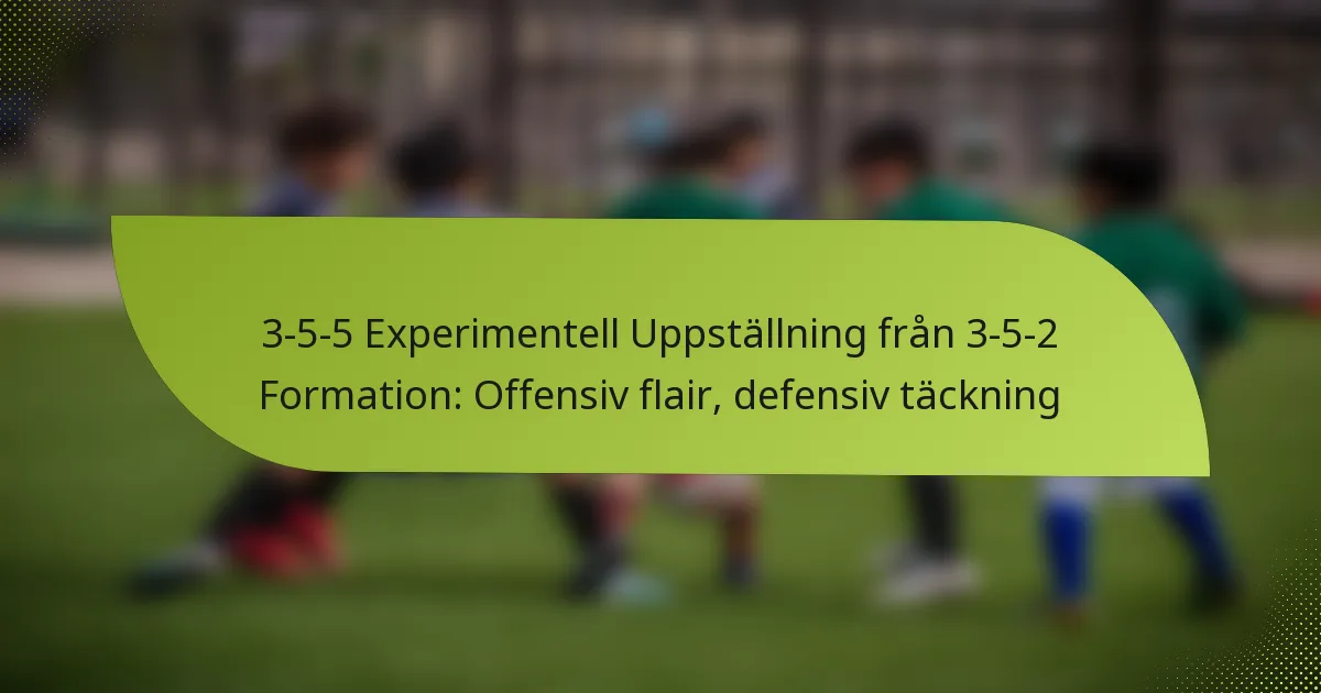 3-5-5-experimentuppställningen är en taktisk strategi inom fotboll som balanserar offensiv kreativitet med solid defensiv täckning. Genom att använda tre försvarare, fem mittfältare och två anfallare förbättrar denna formation offensiva alternativ samtidigt som den säkerställer en robust defensiv struktur. Lag kan utnyttja bredden och flexibiliteten i denna uppställning för att skapa dynamiska spel och upprätthålla stabilitet under omställningar. Vad är 3-5-5-formationen i fotboll? 3-5-5-formationen är en taktisk uppställning inom fotboll som betonar både offensiv flair och defensiv stabilitet. Den består av tre försvarare, fem mittfältare och två anfallare, vilket gör att lagen kan behålla bollinnehav samtidigt som de erbjuder tillräcklig täckning…